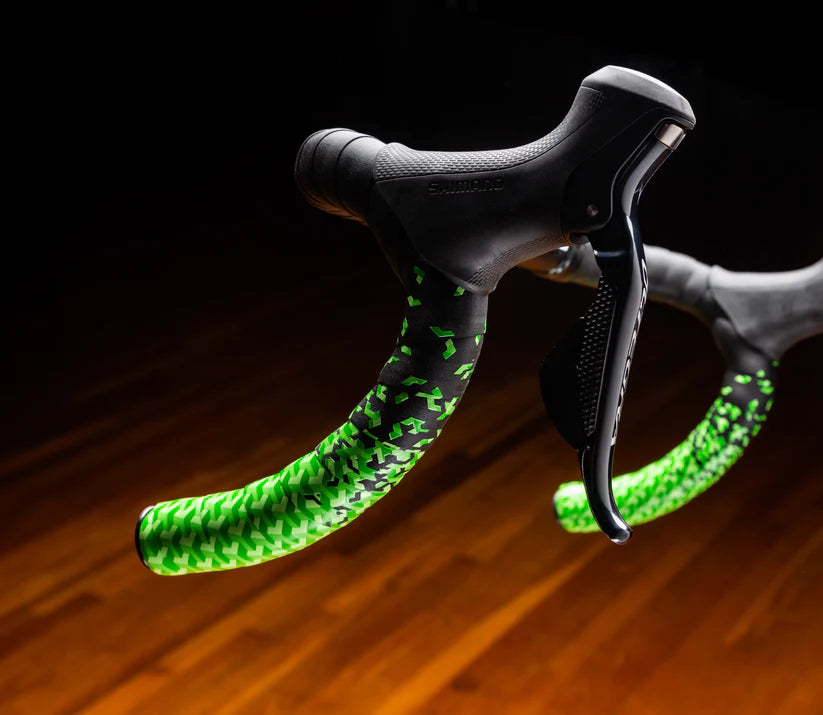 Art Gecko is our new grippy polyurethane rubber bar tape with a colorful artistic patter on the drops. This pattern is called a tri-color tessellation. When wrapped from the bottom it fades to black about where the brake levers mount.