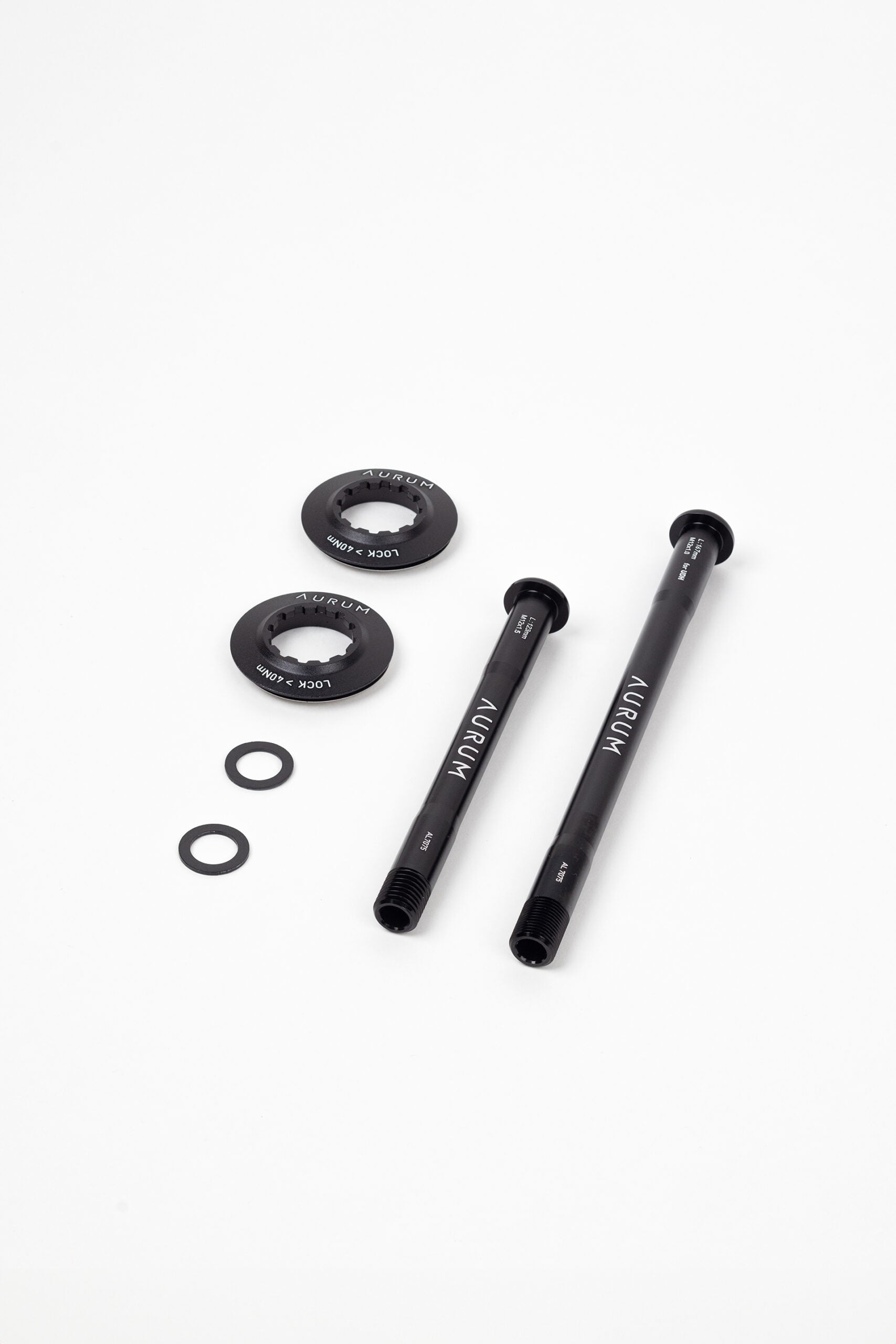 Upgrade your gravel bike with this axle kit. It includes the Aurum rotor lock ring, front and rear thru axles, and PA washers for the axle head. Ensure a secure connection and optimal performance on various terrains.